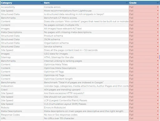 The first step to any SEO strategy should be a thorough analysis of the technical and on-page factors that may affect the website. The accompanying image shows what our technical analysis of this Canadian ecommerce website revealed.