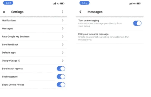 Once the app has downloaded, sign in to your GMB account and select “Settings”. Under the “Messages” section, you can tap the button to turn on messaging.