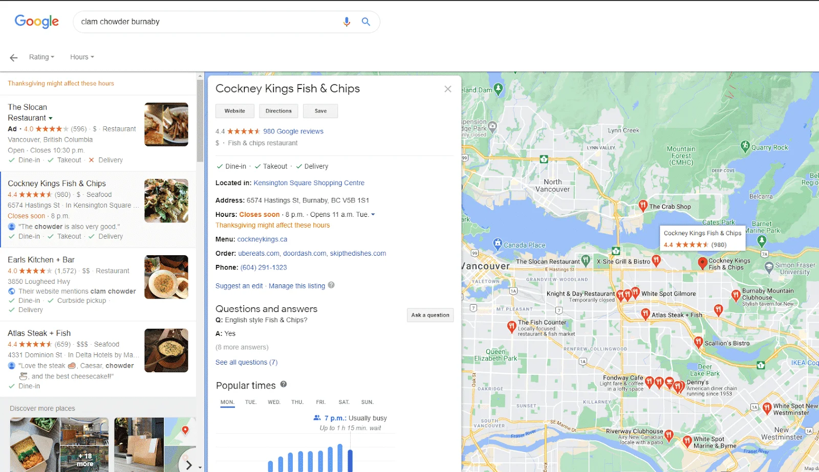 The first thing you have to understand about GMB is that it’s Google’s equivalent to a business directory – and so much more. Imagine you’re craving some clam chowder, and you’re looking for the best spot to get it in Burnaby. You might make a query like “clam chowder burnaby” or “best clam chowder”. Your results might look like this: