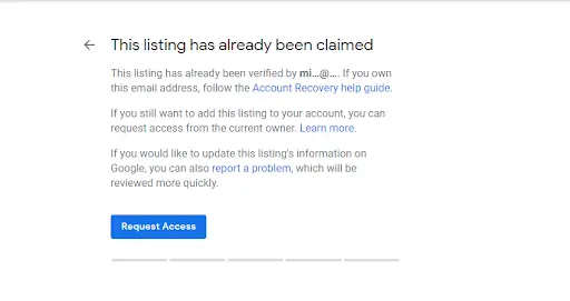 That means someone has already claimed the listing for your GMB. More often than not, it will be someone on your team, or a previous owner. Should you find yourself unable to find who claimed the GMB, click Request Access for support from Google.